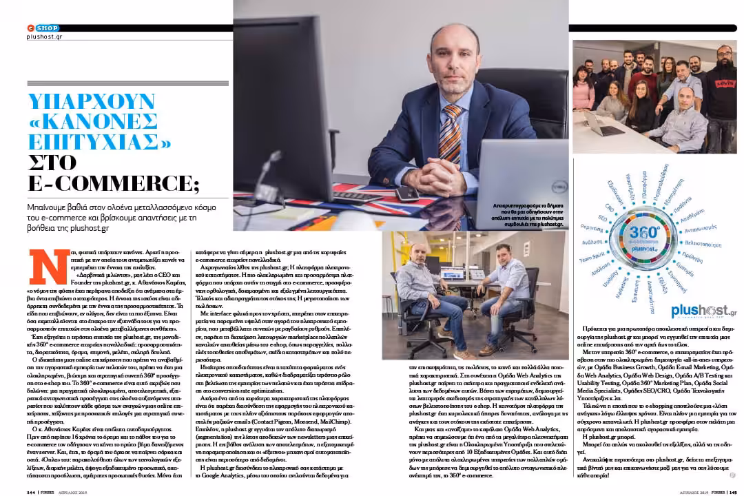 Για τους κανόνες επιτυχίας στο e-commerce και την δημοφιλή υπηρεσία της plushost.gr, 360o, μίλησε ο Θανάσης Καμέας ,CEO της plushost.gr, στη συνέντευξη εφ’ όλης της ύλης, που έδωσε στο περιοδικό Forbes τον Απρίλιο του 2019.