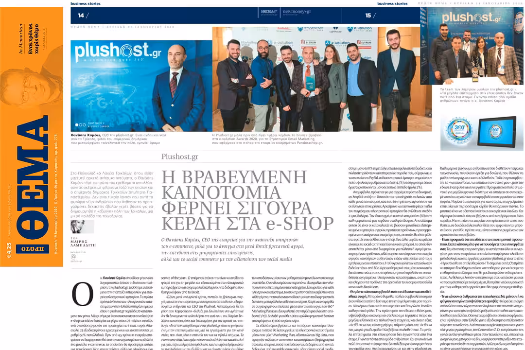 Σε μία δισέλιδη συνέντευξη ο Θανάσης Καμμέας, CEO της Plushost, που παραχώρησε στην εφημερίδα Πρώτο Θέμα την Κυριακή 19 Ιανουαρίου 2020, μιλάει για την ανάπτυξη του e-commerce στην Ελλάδα, τις καινοτόμες υπηρεσίες που προσφέρει η Plushost και τα επόμενα βήματα της εταιρίας στο εξωτερικό.