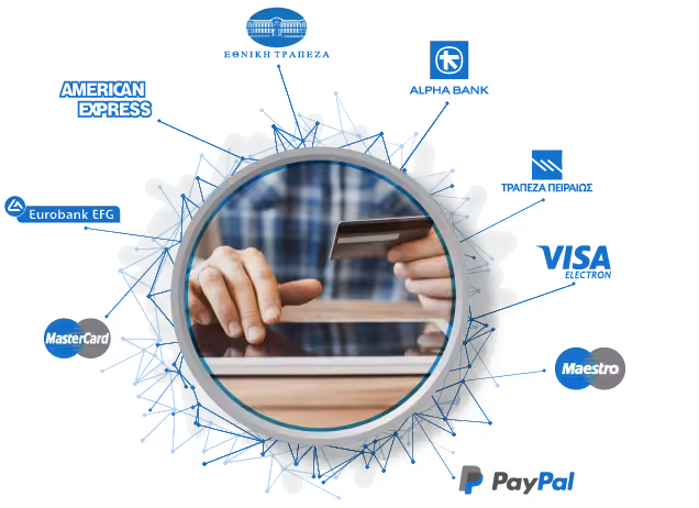 Εξασφαλίζουμε τη διασύνδεση του ηλεκτρονικού σας καταστήματος με όλες τις Τράπεζες στην Ελλάδα (Τράπεζα Πειραιώς, Εθνική Τράπεζα, Alpha Bank, Eurobank EFG και όποια άλλη συνεργάζεστε) και με όλες τις πιστωτικές κάρτες (VISA, Electron VISA, Master Card, AMEX, Maestro) καθώς και με Prepaid Card. Επίσης, παρέχουμε διασύνδεση με PayPal καθώς και με όποιο άλλο payment gateway επιθυμείτε.